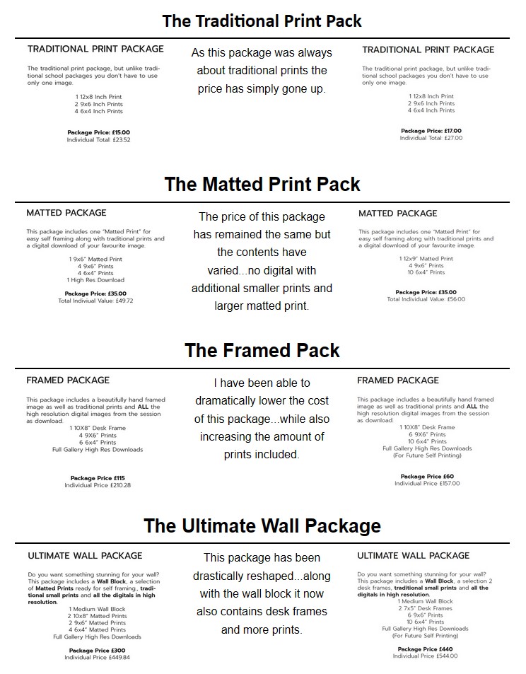 Core print prices have risen and therefore so have the packages (except the framed package which has come down a lot)…but with some negotiation we’ve been able to get a compromise that means they packages actually contain more too.